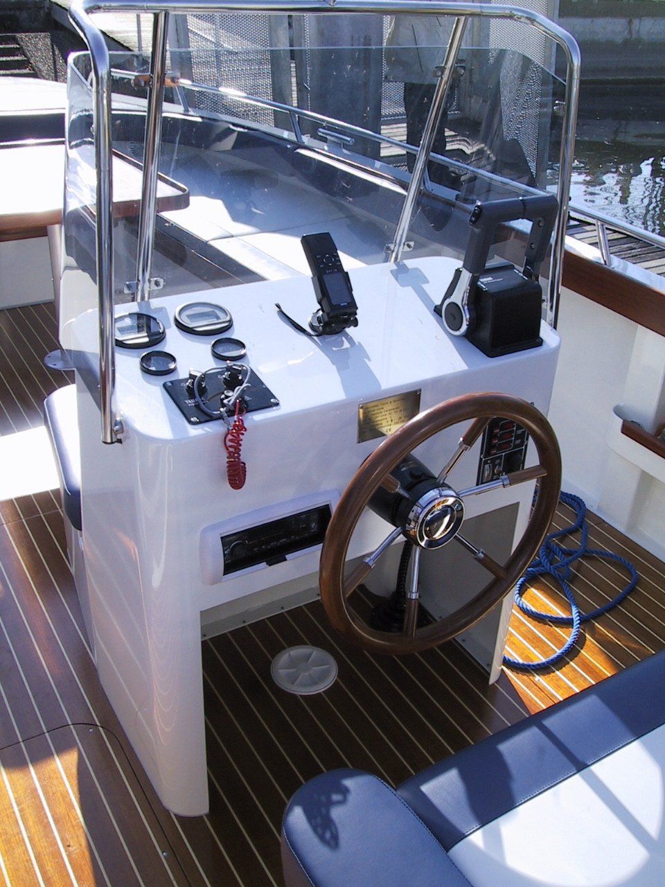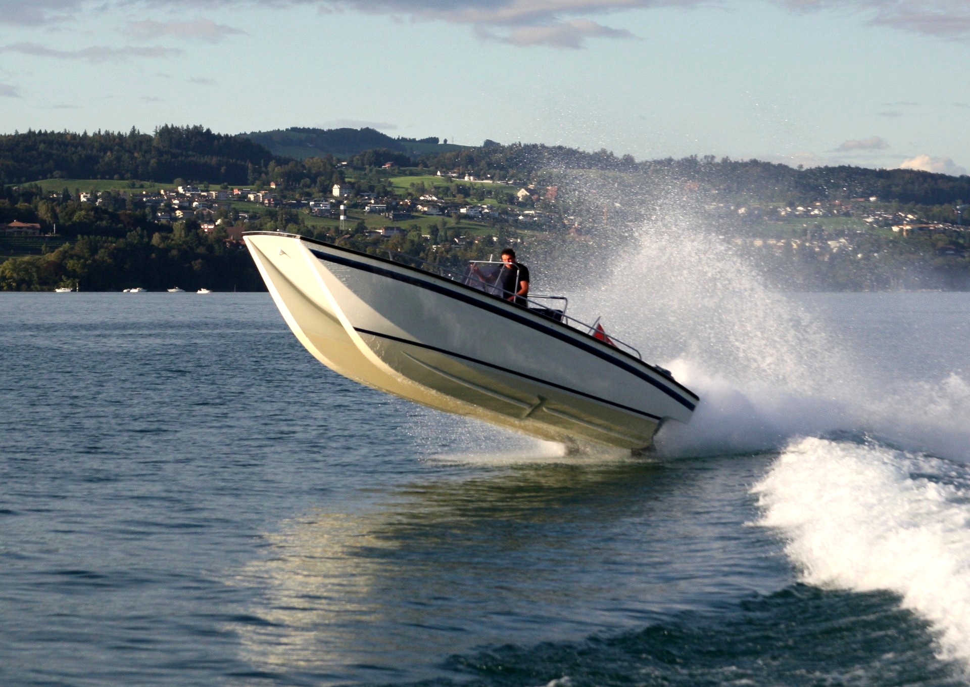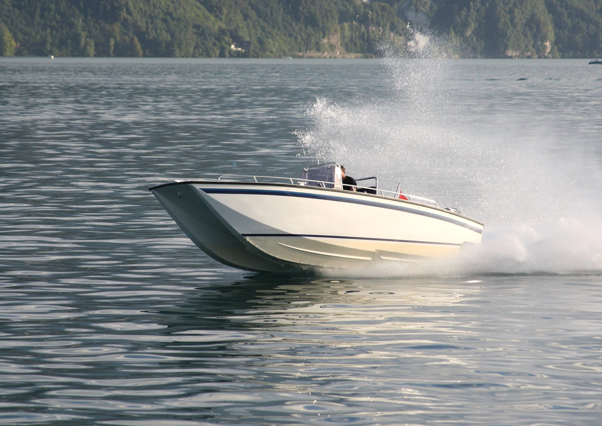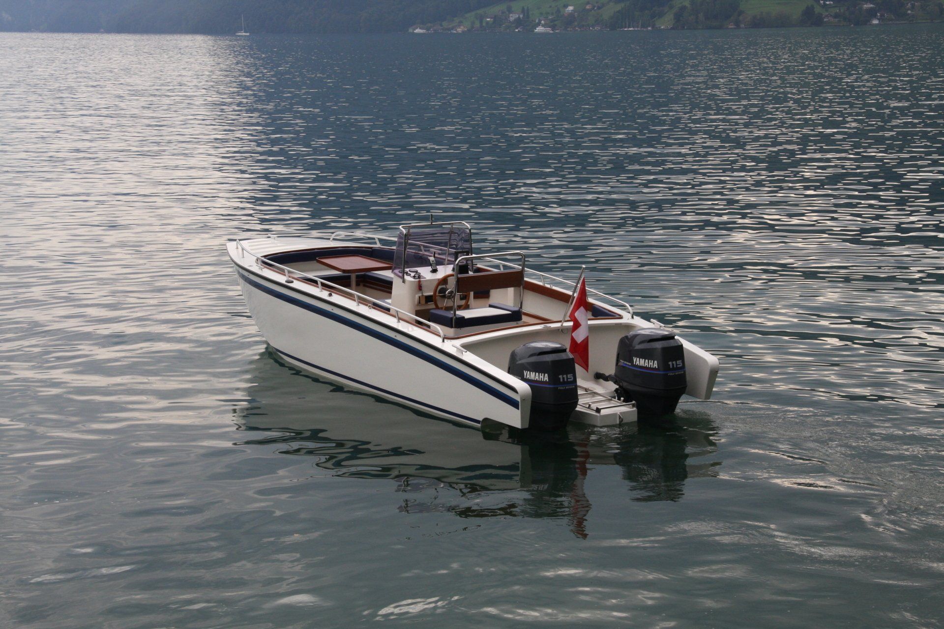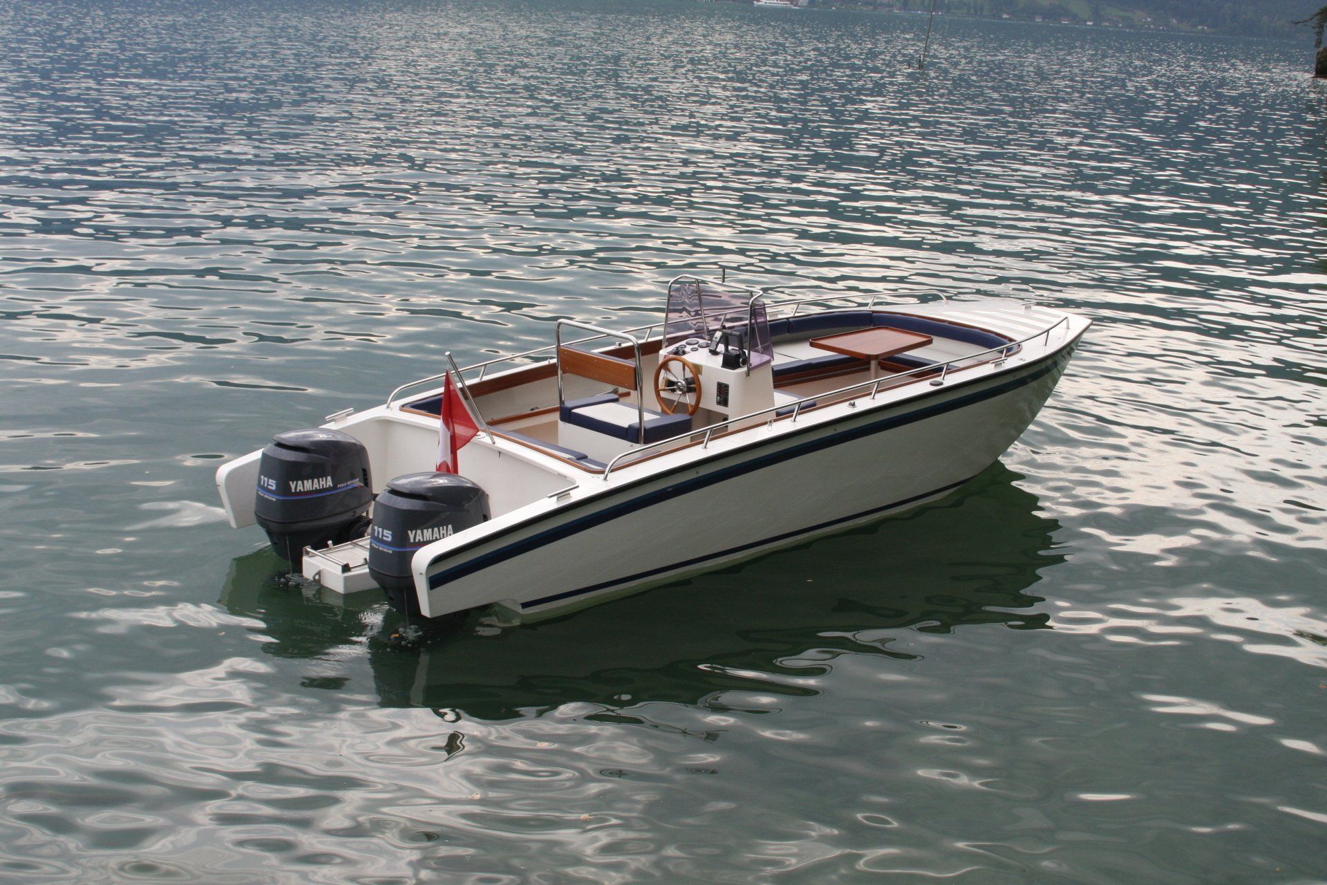 Privatboot nach Kundenwunsch in Katamaran-Bauform mit grosser Eckbank, umfunktionierbar zur Liegefläche.