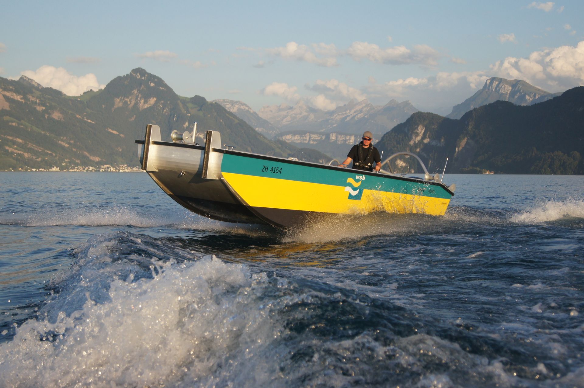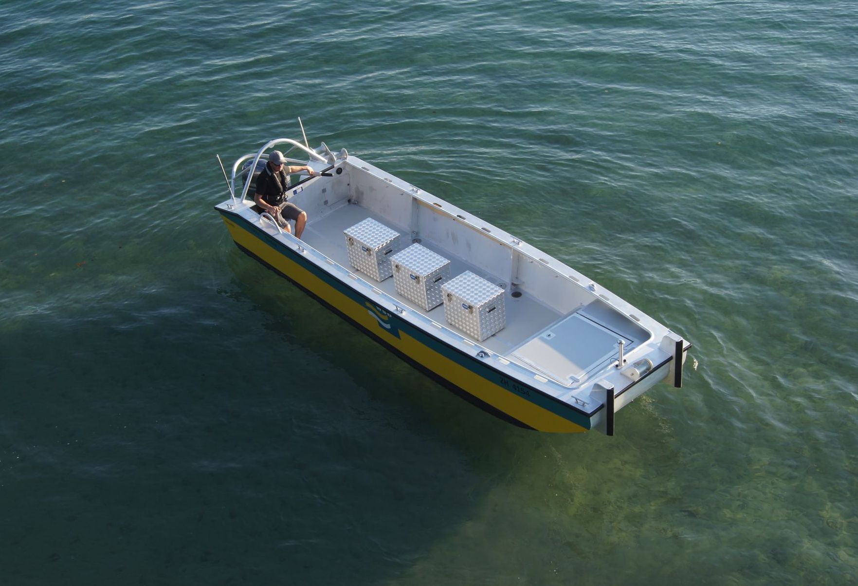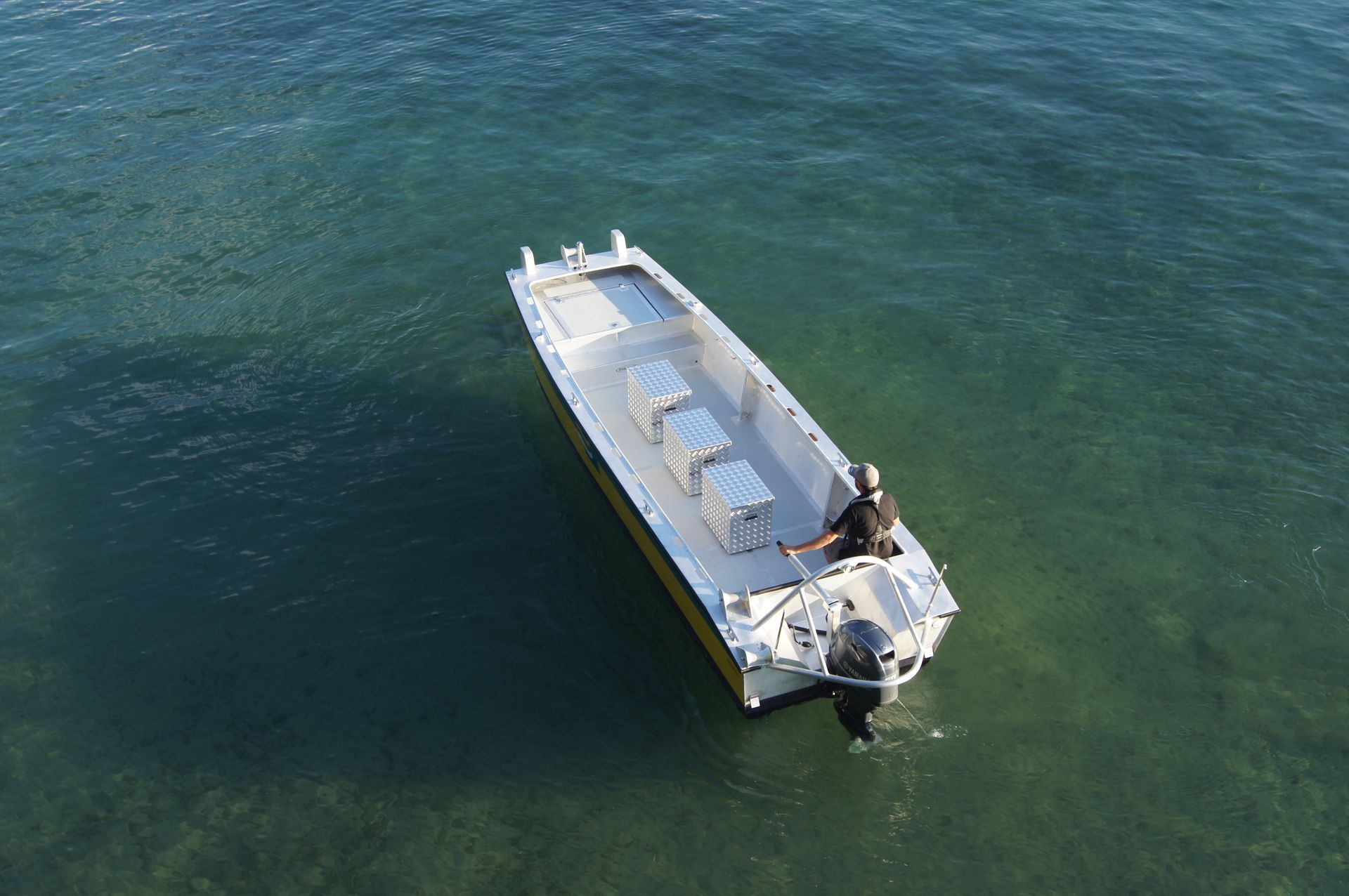 Das Arbeitsboot ist komplett selbstlenzend und unsinkbar. Die Katamaran-Bauform ermöglicht eine hohe Stabilität und eine solide Kursfahrt.