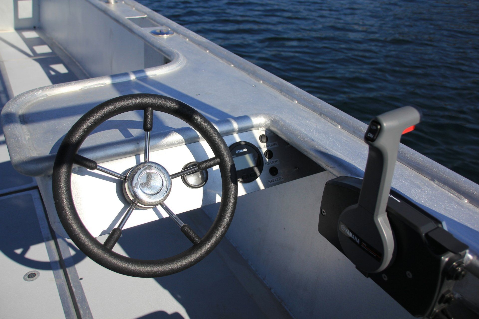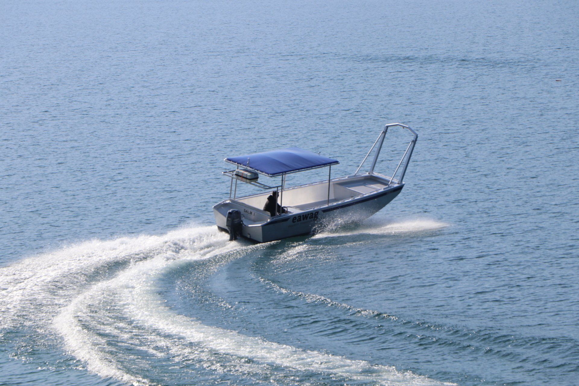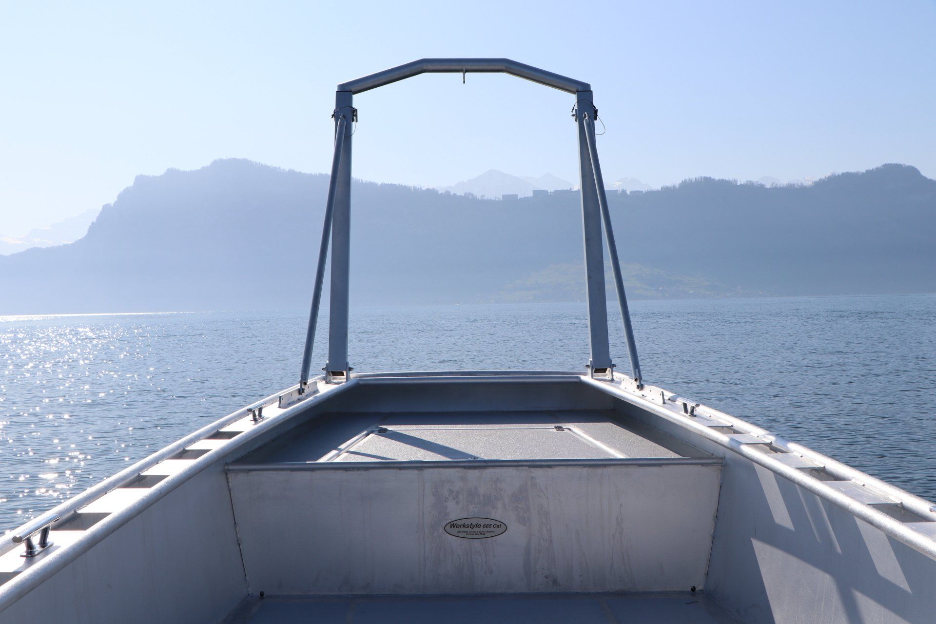 Das Arbeitsboot ist komplett selbstlenzend und unsinkbar. A-Frame am Bug dient als Kran zum Arbeiten über dem Bug. Die Katamaran-Bauform ermöglicht eine hohe Stabilität und eine solide Kursfahrt.