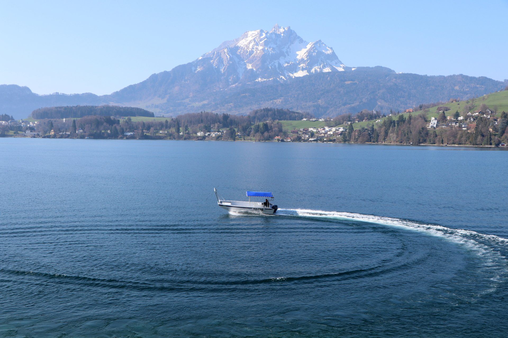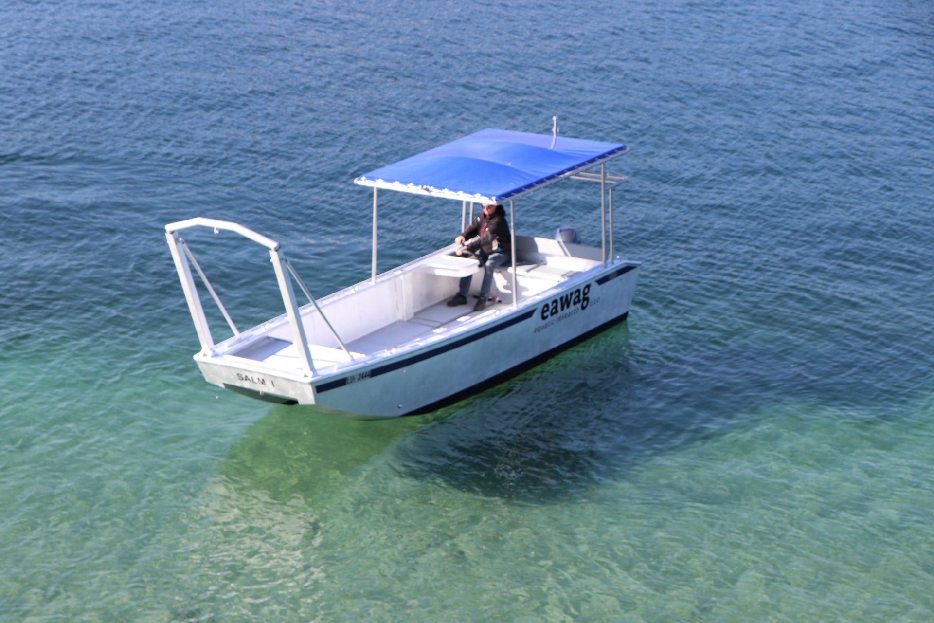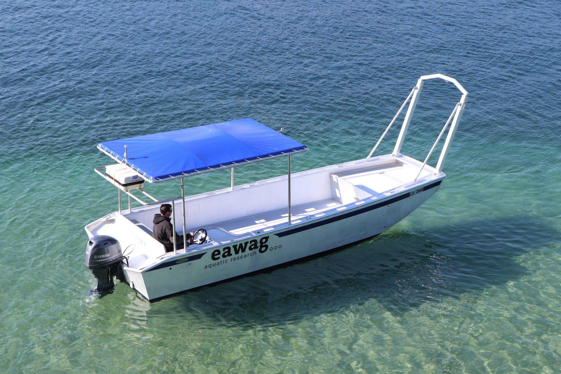 Das Arbeitsboot ist komplett selbstlenzend und unsinkbar. A-Frame am Bug dient als Kran zum Arbeiten über dem Bug. Die Katamaran-Bauform ermöglicht eine hohe Stabilität und eine solide Kursfahrt.