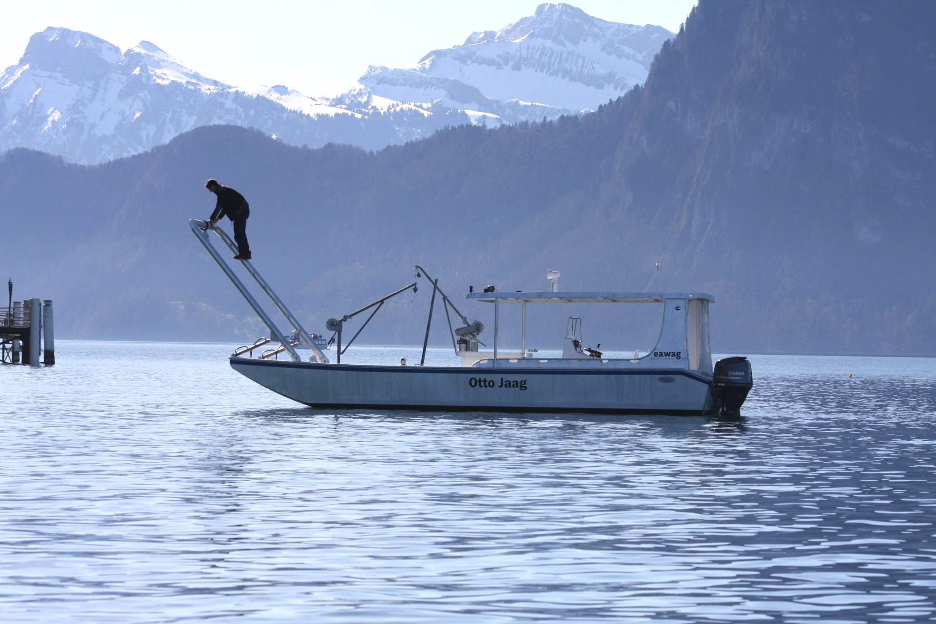 Das Arbeitsboot ist komplett selbstlenzend und unsinkbar. A-Frame hydraulisch klappbar mit 500 kg Seilwinde und zwei Seitenkranen.